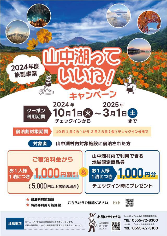 10/1より【山中湖旅割】割引&地域クーポン券進呈プランが始まります。